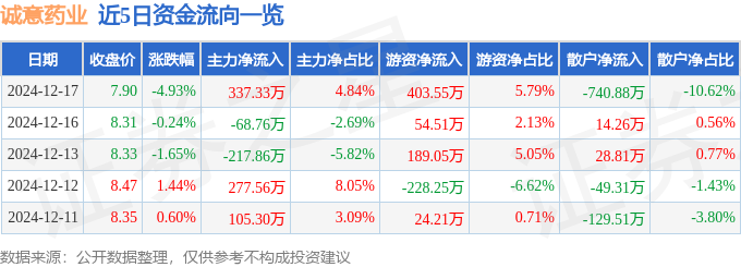 12月17日的资金流向数据方面,主力资金净流入337.33万元,占总成交额4.84%,游资资金净流入403.55万元,占总成交额5.79%,散户资金净流出740.88万元,占总成交额10.62%。