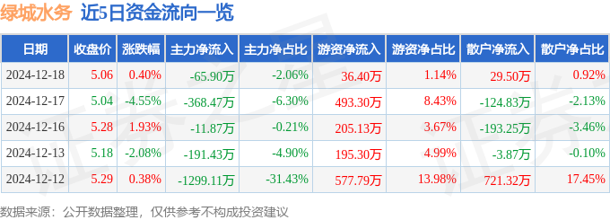 证券之星消息,截至2024年12月18日收盘,绿城水务(601368)报收于5.06元,上涨0.4%,换手率0.71%,成交量6.3万手,成交额3206.34万元。