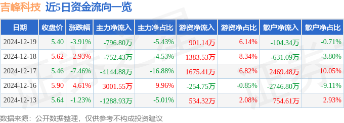 12月19日的资金流向数据方面,主力资金净流出796.8万元,占总成交额5.43%,游资资金净流入901.14万元,占总成交额6.14%,散户资金净流出104.34万元,占总成交额0.71%。