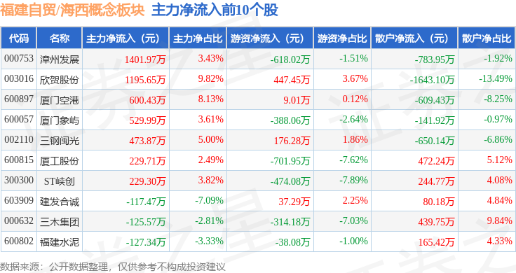 从资金流向上来看,当日福建自贸/海西概念板块主力资金净流出1.63亿元,游资资金净流出1202.42万元,散户资金净流入1.75亿元。福建自贸/海西概念板块个股资金流向见下表: