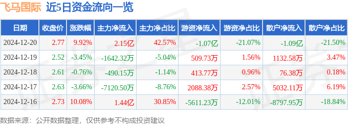 证券之星消息,截至2024年12月20日收盘,飞马国际(002210)报收于2.77元,上涨9.92%,涨停,换手率6.89%,成交量183.47万手,成交额5.05亿元。