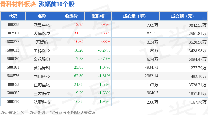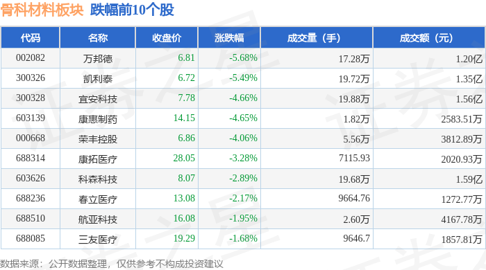 证券之星消息,12月25日骨科材料板块较上一交易日下跌1.97%,万邦德领跌。当日上证指数报收于3393.35,下跌0.01%。深证成指报收于10603.1,下跌0.64%。骨科材料板块个股涨跌见下表: