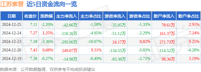 12月25日的资金流向数据方面,主力资金净流出42.66万元,占总成交额1.58%,游资资金净流出35.95万元,占总成交额1.33%,散户资金净流入78.61万元,占总成交额2.91%。
