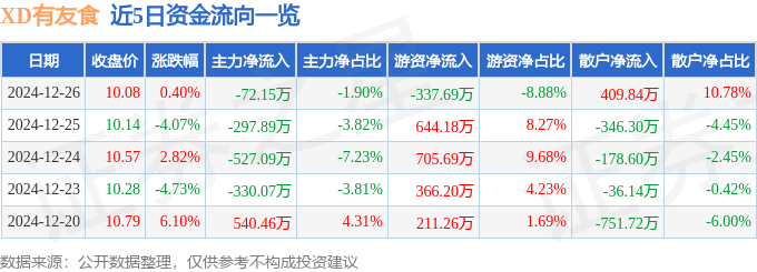 证券之星消息,截至2024年12月26日收盘,XD有友食(603697)报收于10.08元,上涨0.4%,换手率0.88%,成交量3.77万手,成交额3803.41万元。