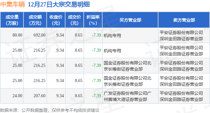 证券之星消息,12月27日中集车辆发生大宗交易,交易数据如下: