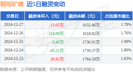 证券之星消息,12月27日,铜冠矿建(920019)融资买入99.04万元,融资偿还85.39万元,融资净买入13.65万元,融资余额1632.46万元。