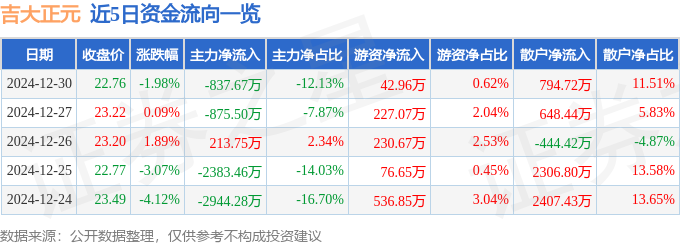 12月30日的资金流向数据方面,主力资金净流出837.67万元,占总成交额12.13%,游资资金净流入42.96万元,占总成交额0.62%,散户资金净流入794.72万元,占总成交额11.51%。