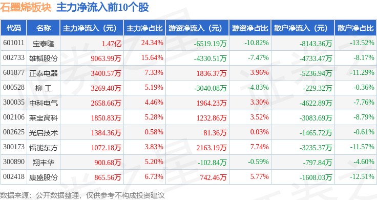 从资金流向上来看,当日石墨烯板块主力资金净流出9.27亿元,游资资金净流入1339.23万元,散户资金净流入9.14亿元。石墨烯板块个股资金流向见下表: