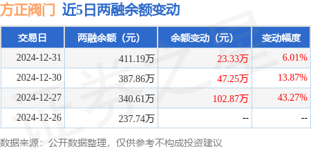 证券之星消息,12月31日,方正阀门(920082)融资买入78.9万元,融资偿还55.57万元,融资净买入23.33万元,融资余额411.19万元,近3个交易日已连续净买入累计173.44万元。