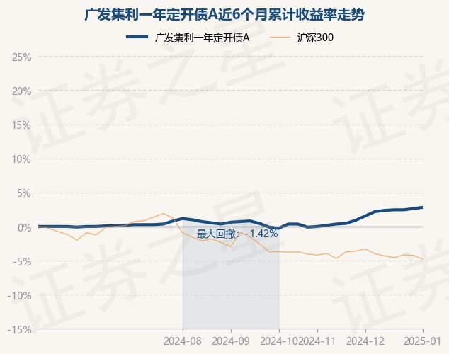 证券之星消息,1月2日,广发集利一年定开债A最新单位净值为1.133元,累计净值为1.754元,较前一交易日上涨0.18%。历史数据显示该基金近1个月上涨1.89%,近3个月上涨2.9%,近6个月上涨2.81%,近1年上涨7.65%。该基金近6个月的累计收益率走势如下图: