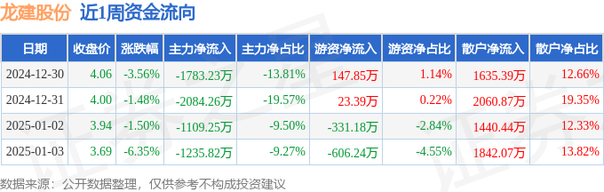资金流向数据方面,本周龙建股份主力资金合计净流出6212.57万元,游资资金合计净流出766.19万元,散户资金合计净流入6978.76万元。本周资金流向一览见下表: