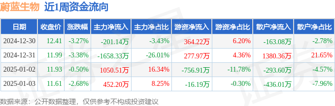 资金流向数据方面,本周蔚蓝生物主力资金合计净流出356.77万元,游资资金合计净流出130.9万元,散户资金合计净流入487.67万元。本周资金流向一览见下表:
