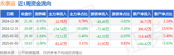 资金流向数据方面,本周永泰运主力资金合计净流出211.4万元,游资资金合计净流出141.35万元,散户资金合计净流入352.75万元。本周资金流向一览见下表: