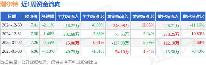 资金流向数据方面,本周瑞尔特主力资金合计净流出245.78万元,游资资金合计净流入87.44万元,散户资金合计净流入158.33万元。本周资金流向一览见下表: