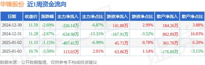 资金流向数据方面,本周华锋股份主力资金合计净流出1255.49万元,游资资金合计净流入83.53万元,散户资金合计净流入1171.96万元。本周资金流向一览见下表: