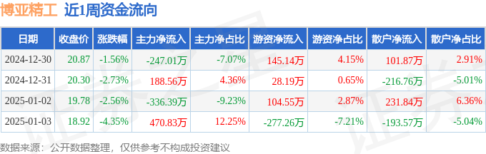资金流向数据方面,本周博亚精工主力资金合计净流入76.0万元,游资资金合计净流入0.62万元,散户资金合计净流出76.62万元。本周资金流向一览见下表: