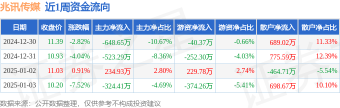 沪深股通持股方面,截止2025年1月3日收盘,兆讯传媒深股通持股数为119.69万股,占流通股比为118.0%。