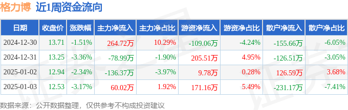 资金流向数据方面,本周格力博主力资金合计净流入109.37万元,游资资金合计净流入277.38万元,散户资金合计净流出386.75万元。本周资金流向一览见下表: