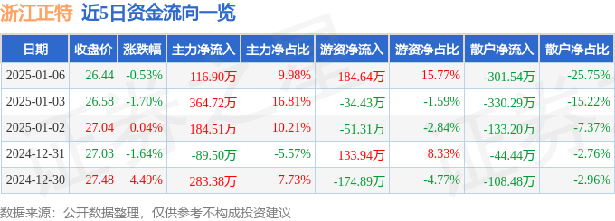 1月6日的资金流向数据方面,主力资金净流入116.9万元,占总成交额9.98%,游资资金净流入184.64万元,占总成交额15.77%,散户资金净流出301.54万元,占总成交额25.75%。