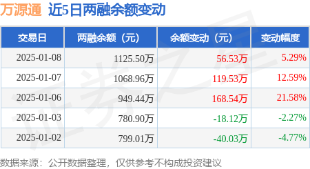 证券之星消息,1月8日,万源通(920060)融资买入126.93万元,融资偿还70.4万元,融资净买入56.53万元,融资余额1125.5万元,近3个交易日已连续净买入累计344.6万元,近20个交易日中有12个交易日出现融资净买入。