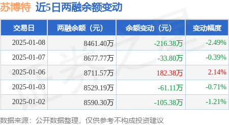 证券之星消息,1月8日,苏博特(603916)融资买入221.93万元,融资偿还438.26万元,融资净卖出216.34万元,融资余额8457.52万元。