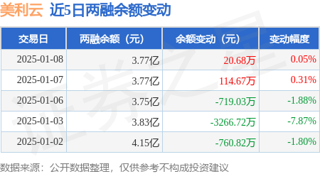 证券之星消息,1月8日,美利云(000815)融资买入1277.66万元,融资偿还1256.98万元,融资净买入20.68万元,融资余额3.77亿元。