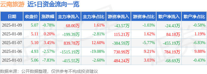 证券之星消息,截至2025年1月9日收盘,云南旅游(002059)报收于5.07元,下跌0.78%,换手率0.88%,成交量8.3万手,成交额4218.19万元。