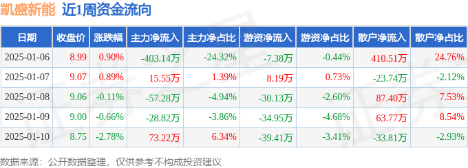 资金流向数据方面,本周凯盛新能主力资金合计净流出400.46万元,游资资金合计净流出103.67万元,散户资金合计净流入504.13万元。本周资金流向一览见下表: