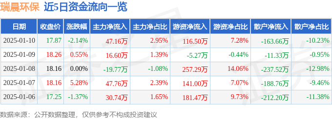 证券之星消息,截至2025年1月10日收盘,瑞晨环保(301273)报收于17.87元,下跌2.14%,换手率2.54%,成交量8809.0手,成交额1600.36万元。