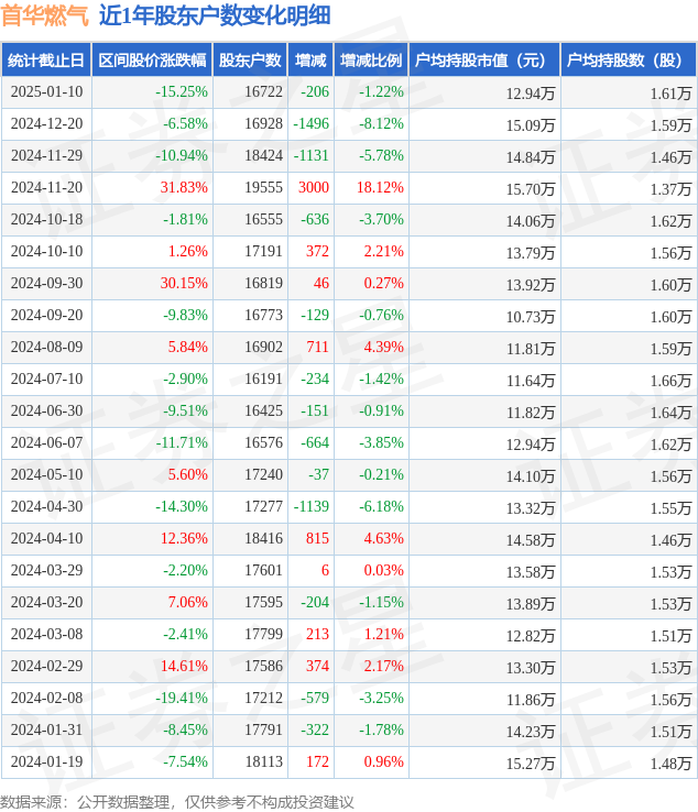 从股价来看,2024年12月20日至2025年1月10日,首华燃气区间跌幅为15.25%,在此期间股东户数减少206.0户,减幅为1.22%。