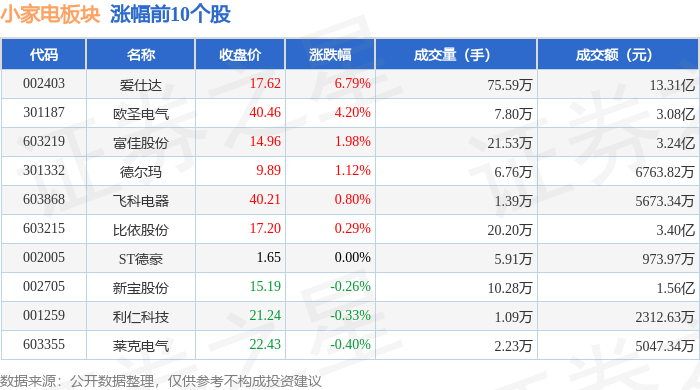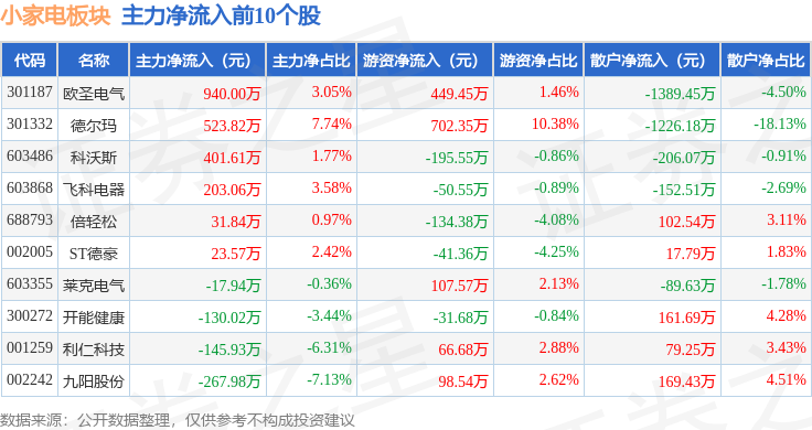 从资金流向上来看,当日小家电板块主力资金净流出1.6亿元,游资资金净流出3886.17万元,散户资金净流入1.99亿元。小家电板块个股资金流向见下表:
