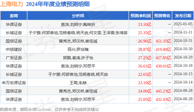 朝阳永续Go-Goal数据显示,此前市场对上海电力业绩的一致预期是:营业总收入为419亿元至451.35亿元;归属于上市公司股东的净利润为23.1亿元至28.87亿元。对比公告披露的数据,上海电力2024年年度业绩低于市场一致预期。