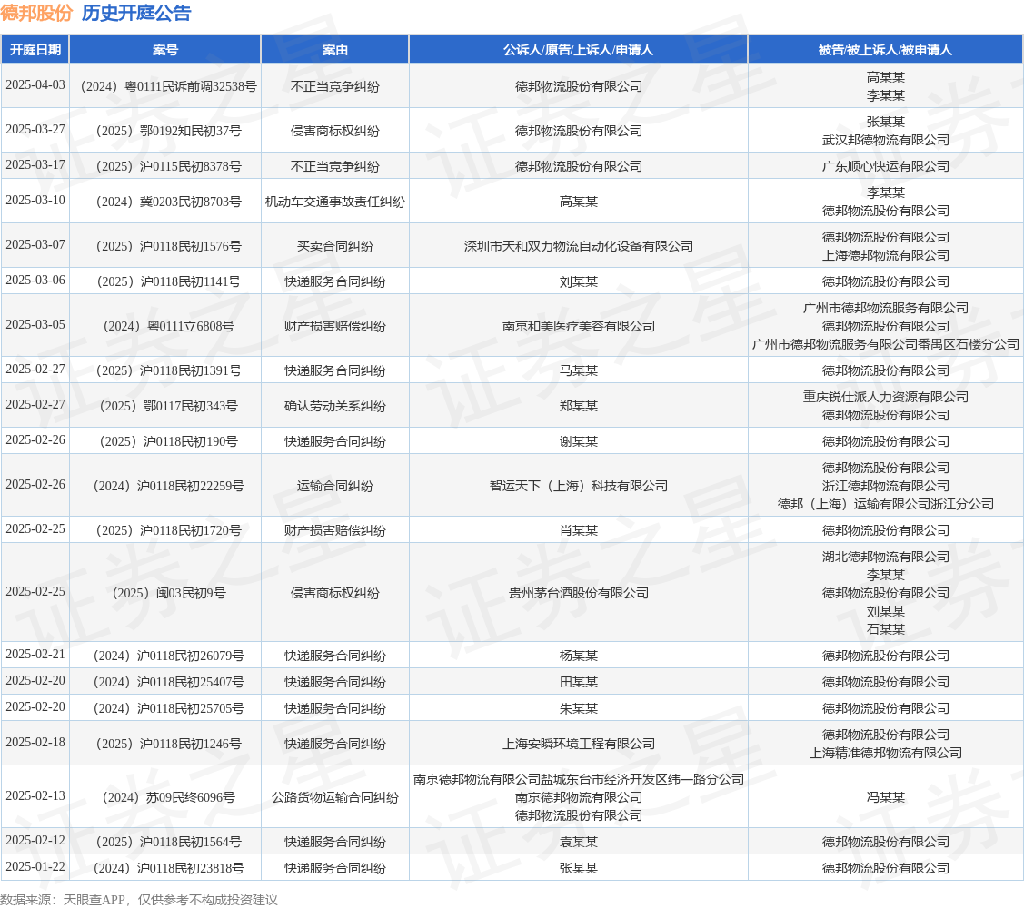 案号:(2024)沪0118民初23818号根据统计,近一年内以德邦物流股份有限公司为当事人的历史开庭公告有361则,其中案由为“快递服务合同纠纷”的公告以106则居首,其次为“运输合同纠纷”有106则,“劳动合同纠纷”有20则。历史开庭公告(前20条)如下: