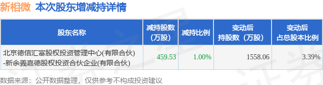 证券之星消息,1月21日新相微发布公告《新相微:新相微股东减持股份结果公告》,其股东北京德信汇富股权投资管理中心(有限合伙)-新余義嘉德股权投资合伙企业(有限合伙)于2025年1月13日至2025年1月20日间合计减持459.53万股,占公司目前总股本的1.0%,变动期间该股股价上涨9.86%,截止1月20日收盘报21.73元。