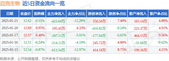 1月21日的资金流向数据方面,主力资金净流出415.64万元,占总成交额12.28%,游资资金净流入250.5万元,占总成交额7.4%,散户资金净流入165.14万元,占总成交额4.88%。