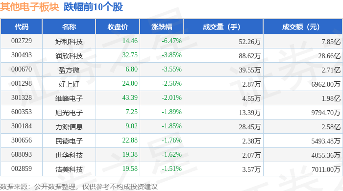 从资金流向上来看,当日其他电子板块主力资金净流出5.57亿元,游资资金净流出8950.72万元,散户资金净流入6.47亿元。其他电子板块个股资金流向见下表: