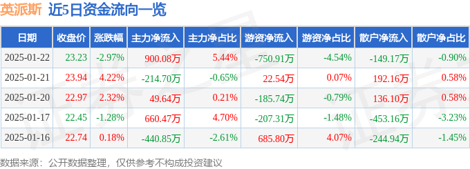 证券之星消息,截至2025年1月22日收盘,英派斯(002899)报收于23.23元,下跌2.97%,换手率4.78%,成交量7.07万手,成交额1.66亿元。