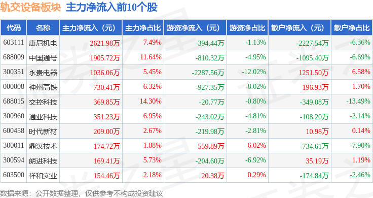 从资金流向上来看,当日轨交设备板块主力资金净流入4353.5万元,游资资金净流出6430.8万元,散户资金净流入2077.3万元。轨交设备板块个股资金流向见下表: