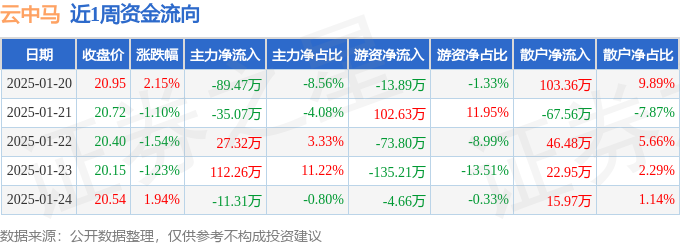 资金流向数据方面,本周云中马主力资金合计净流入3.73万元,游资资金合计净流出124.93万元,散户资金合计净流入121.2万元。本周资金流向一览见下表: