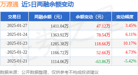 证券之星消息,1月27日,万源通(920060)融资买入157.05万元,融资偿还109.93万元,融资净买入47.12万元,融资余额1411.04万元,近3个交易日已连续净买入累计244.32万元,近20个交易日中有12个交易日出现融资净买入。