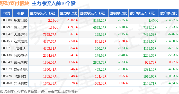 从资金流向上来看,当日移动支付板块主力资金净流出8.18亿元,游资资金净流入1.87亿元,散户资金净流入6.31亿元。移动支付板块个股资金流向见下表: