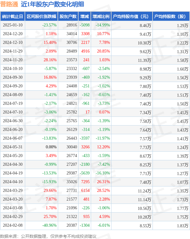 从股价来看,2024年12月20日至2025年1月10日,普路通区间跌幅为23.57%,在此期间股东户数减少5098.0户,减幅为14.99%。