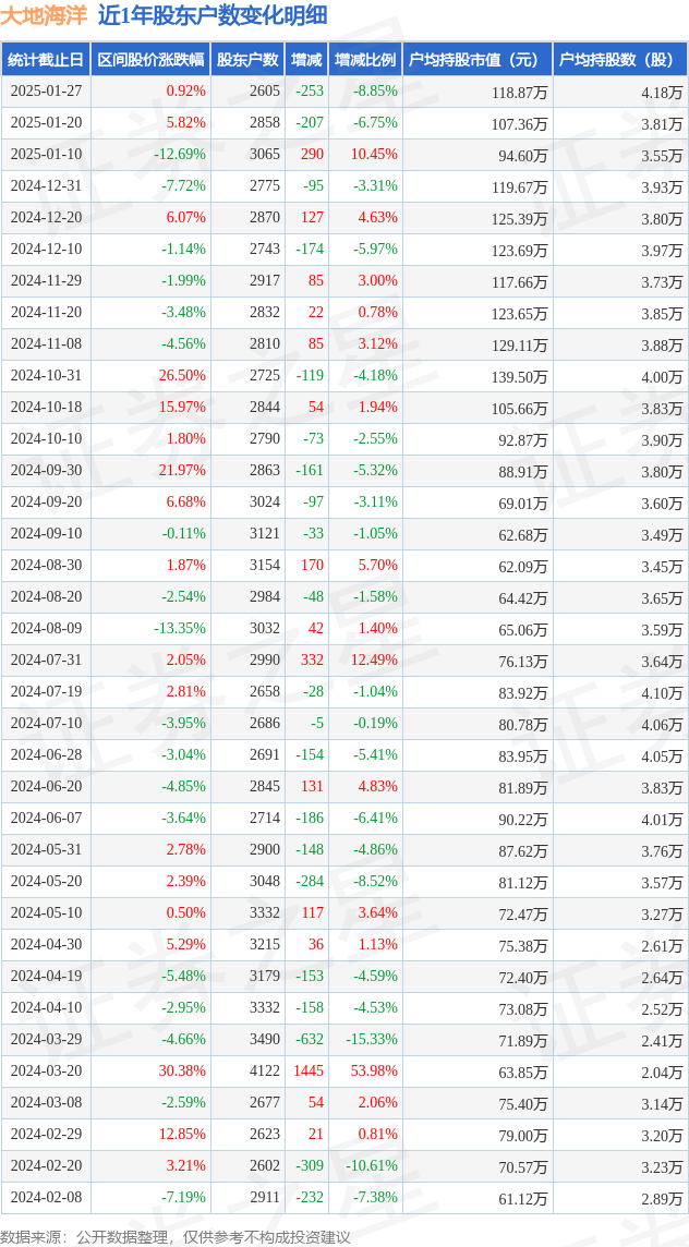 从股价来看,2025年1月20日至2025年1月27日,大地海洋区间涨幅为0.92%,在此期间股东户数减少253.0户,减幅为8.85%。