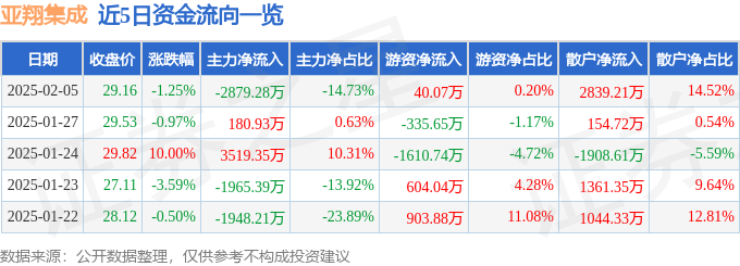 证券之星消息,截至2025年2月5日收盘,亚翔集成(603929)报收于29.16元,下跌1.25%,换手率3.15%,成交量6.72万手,成交额1.96亿元。