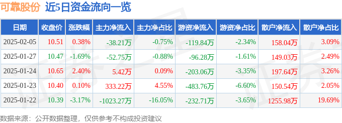 证券之星消息,截至2025年2月5日收盘,可靠股份(301009)报收于10.51元,上涨0.38%,换手率3.7%,成交量4.83万手,成交额5112.05万元。