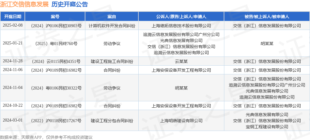 案号:(2024)沪0106民初30903号根据统计,近一年内以交信(浙江)信息发展股份有限公司为当事人的历史开庭公告有7则,其中案由为“劳动争议”的公告以2则居首,其次为“合同纠纷”有2则,“建设工程分包合同纠纷”有1则。历史开庭公告如下:
