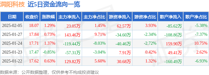 2月5日的资金流向数据方面,主力资金净流入23.05万元,占总成交额1.45%,游资资金净流入62.57万元,占总成交额3.93%,散户资金净流出85.62万元,占总成交额5.38%。