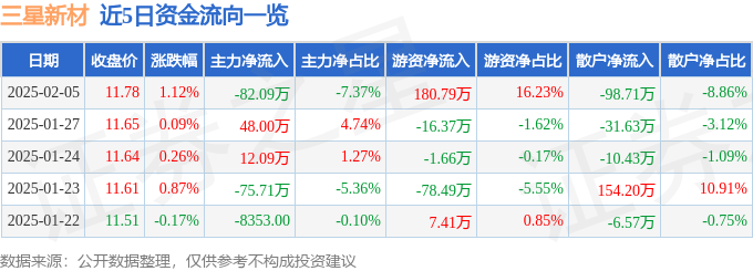 2月5日的资金流向数据方面,主力资金净流出82.09万元,占总成交额7.37%,游资资金净流入180.79万元,占总成交额16.23%,散户资金净流出98.71万元,占总成交额8.86%。