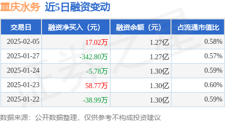 证券之星消息,2月5日,重庆水务(601158)融资买入172.94万元,融资偿还155.92万元,融资净买入17.02万元,融资余额1.27亿元。