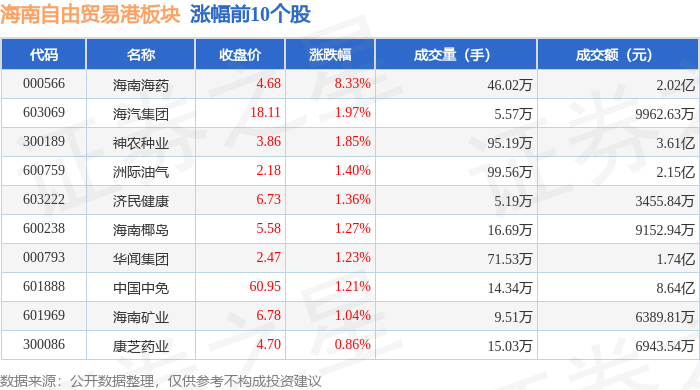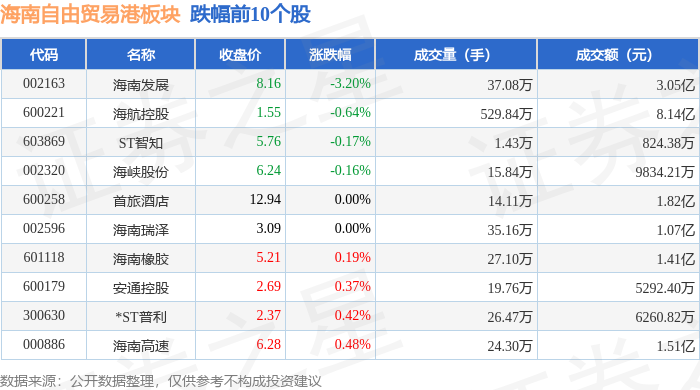 从资金流向上来看,当日海南自由贸易港板块主力资金净流出2.61亿元,游资资金净流入5972.04万元,散户资金净流入2.02亿元。海南自由贸易港板块个股资金流向见下表: